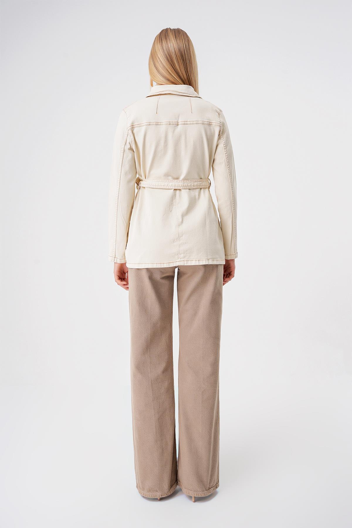 Ekru Kemerli Cep Detayli Standart Kalip Denim Ceket