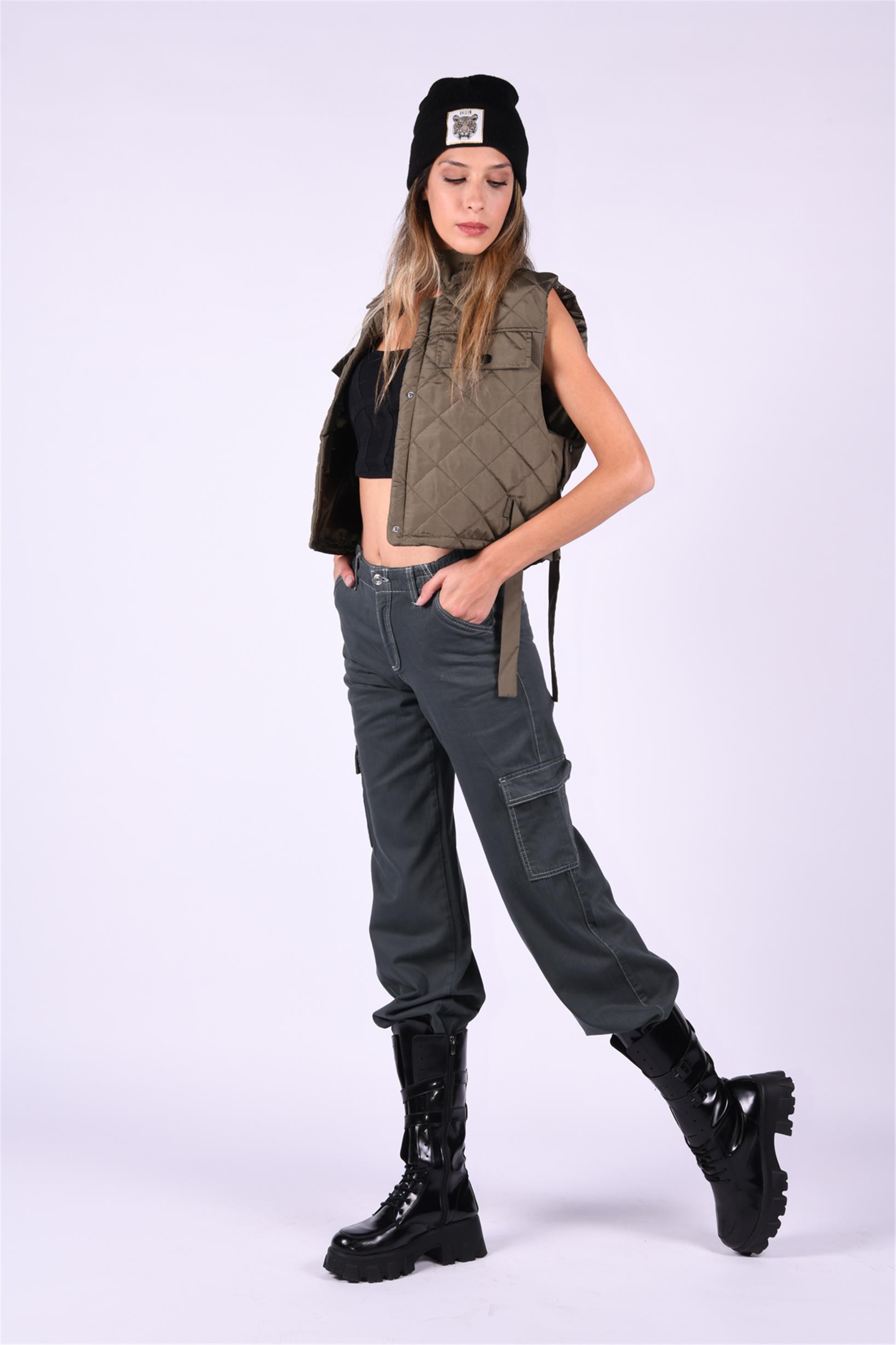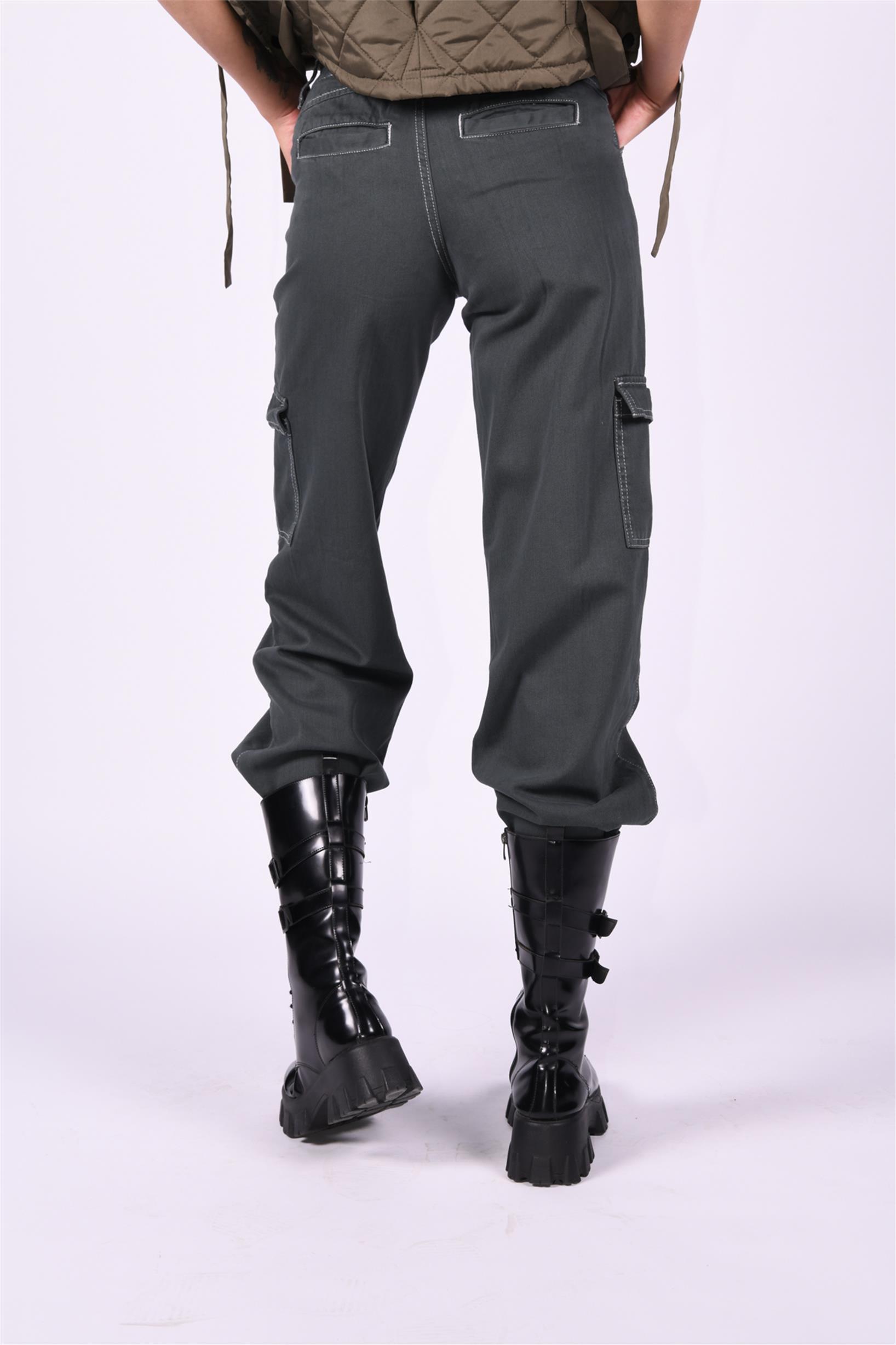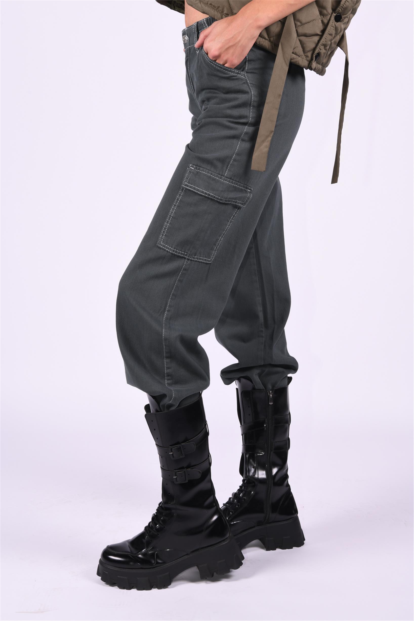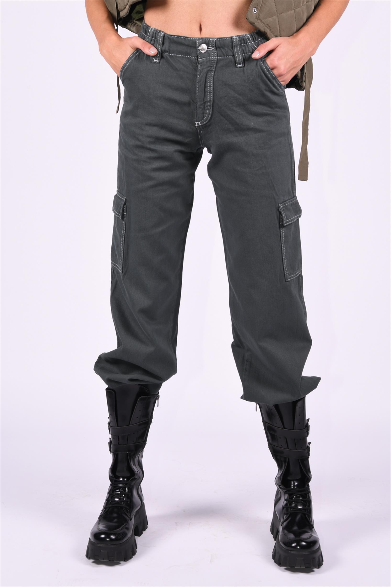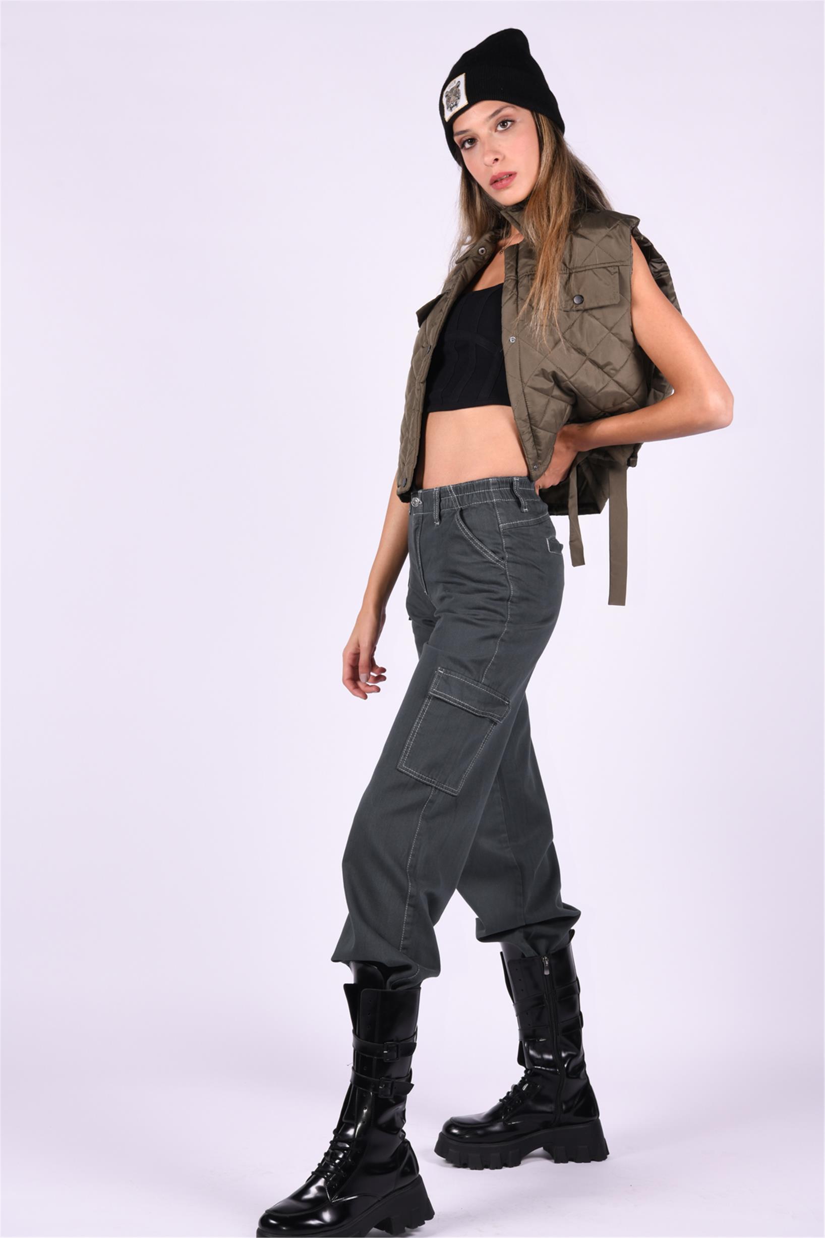 Koyu Gri Normal Bel Beyaz Dikişli Wide Leg Kargo Pantolon