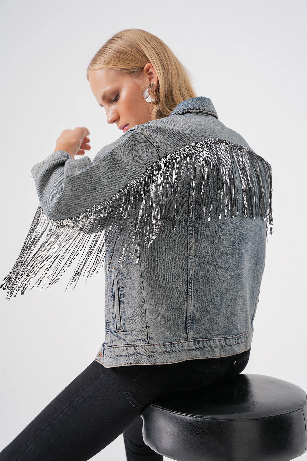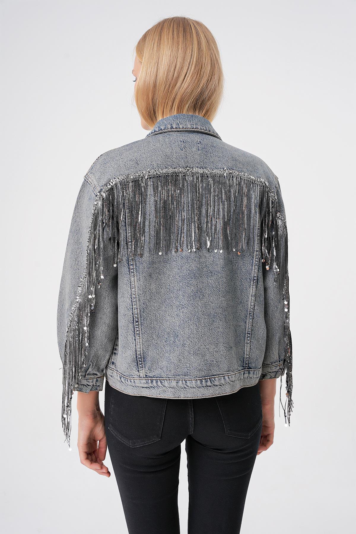 Mavi Vintage Yikama Parlak Pul Detayli Oversize Denim Ceket