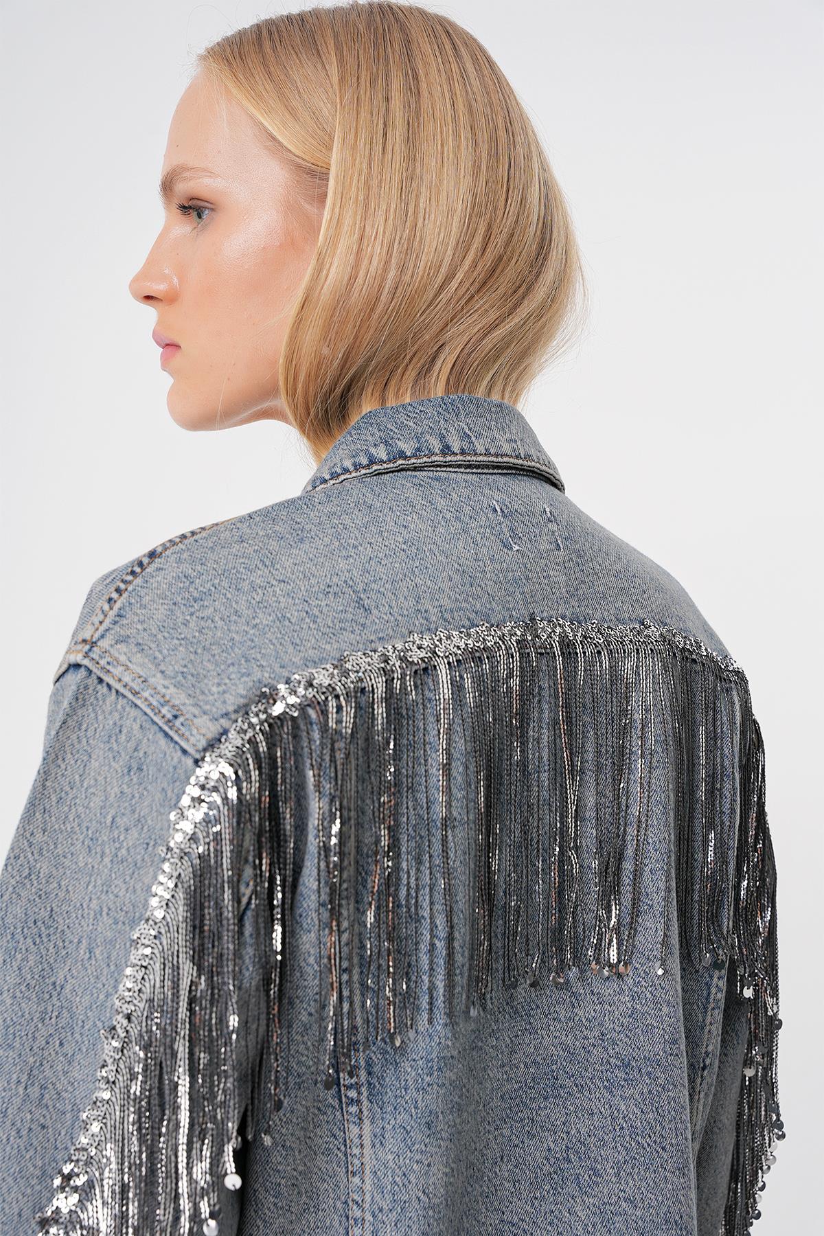 Mavi Vintage Yikama Parlak Pul Detayli Oversize Denim Ceket